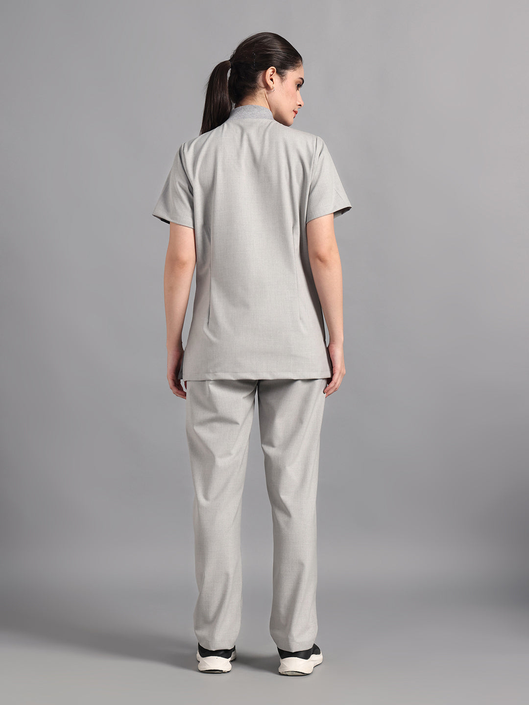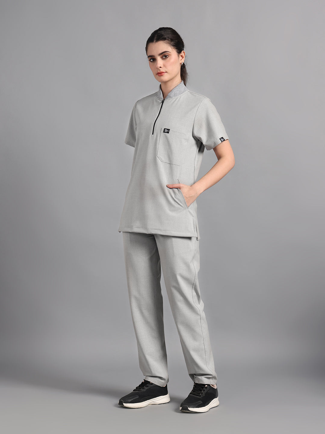 Stretchable (4Way) Light Grey Female Flex Zip Neckline Top With Straight Pants