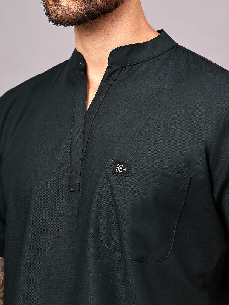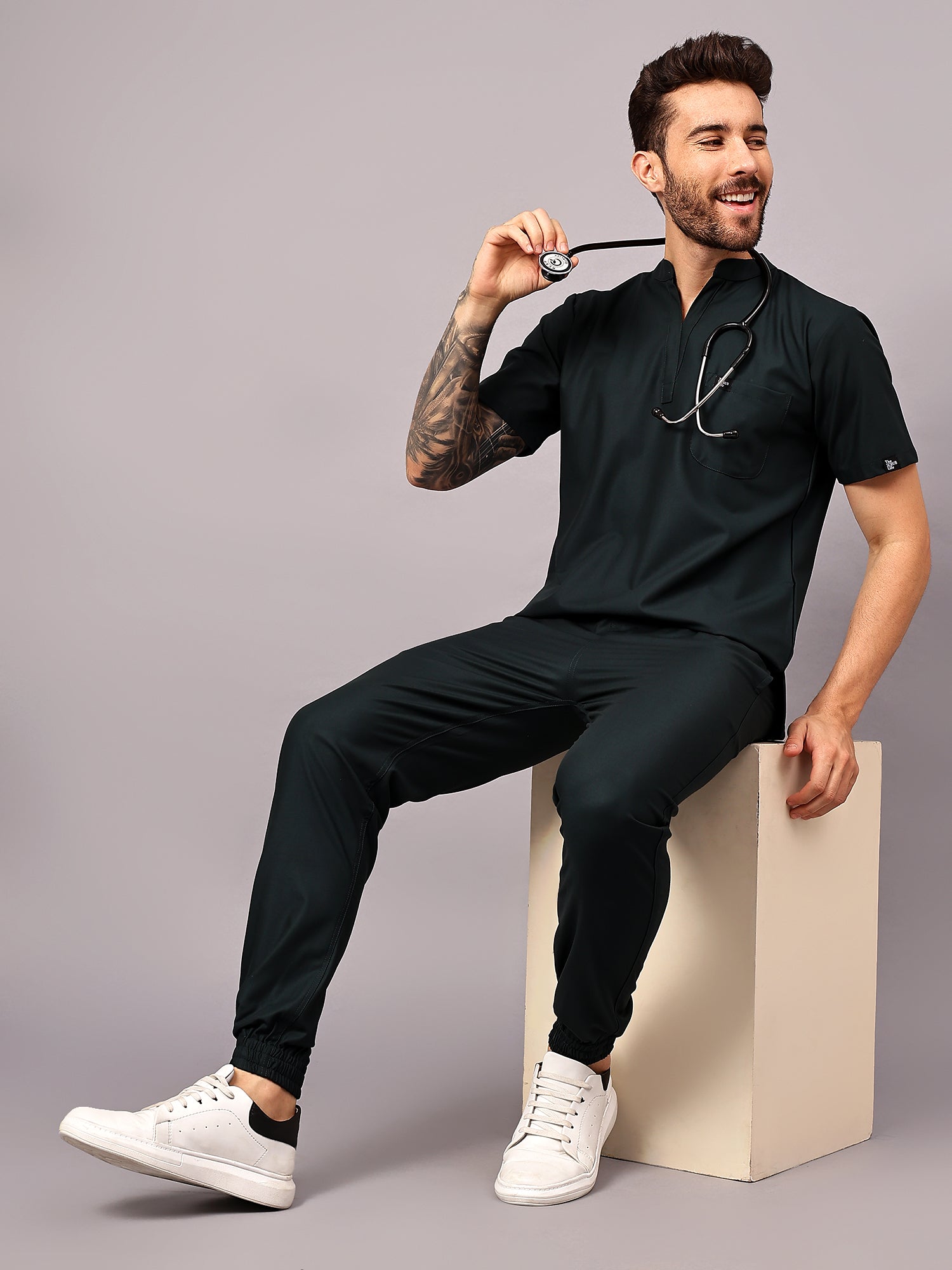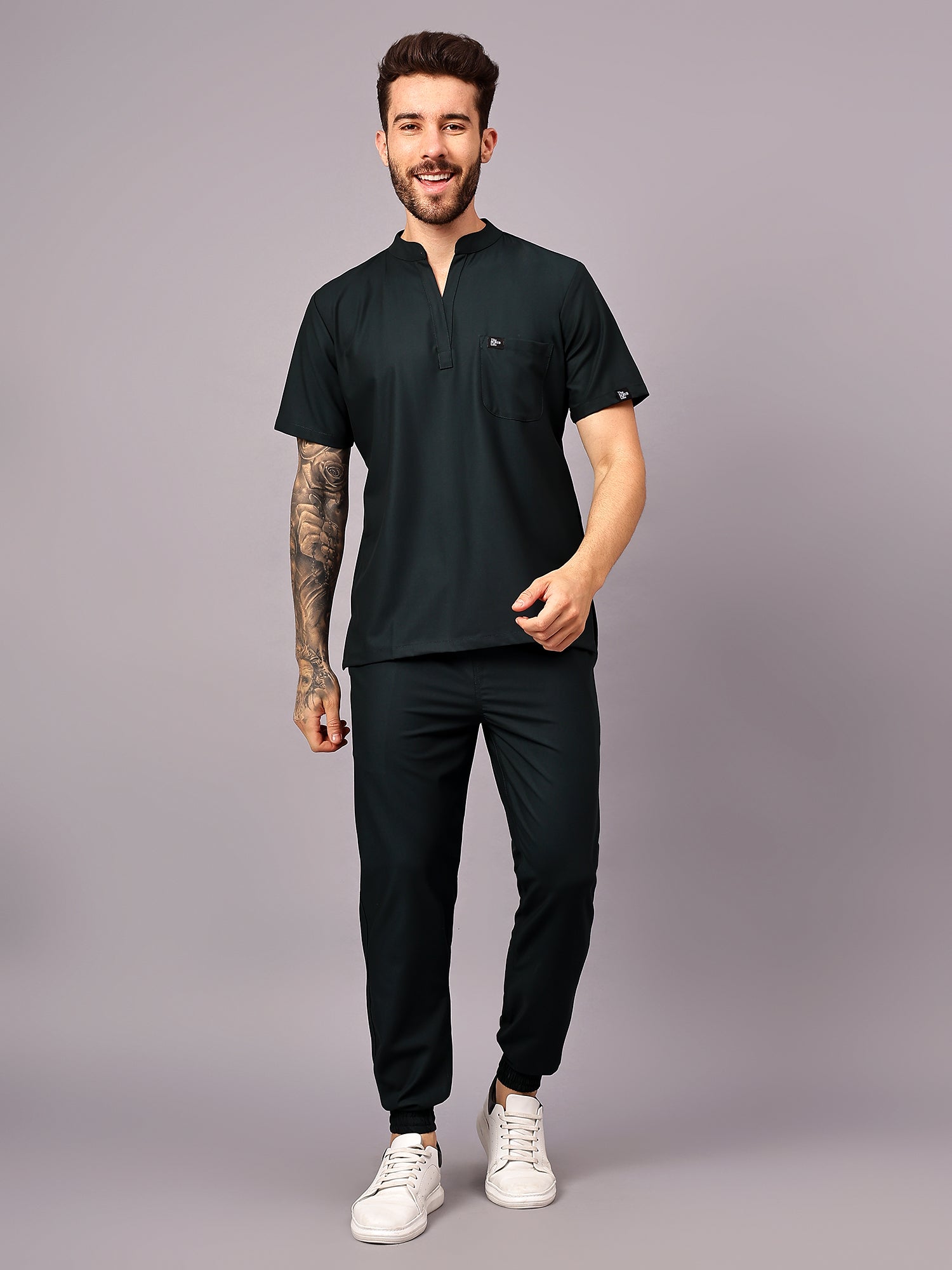 Stretchable (4Way) Male Mid Night Green Mandarin Neck with Jogger Scrub Set