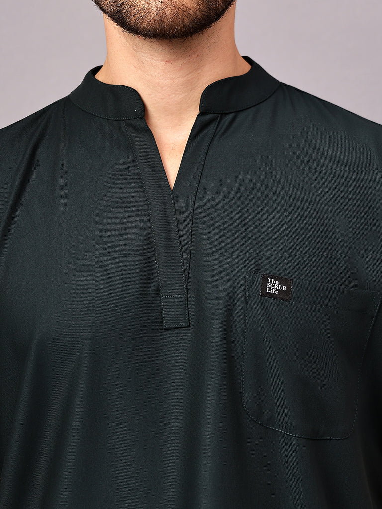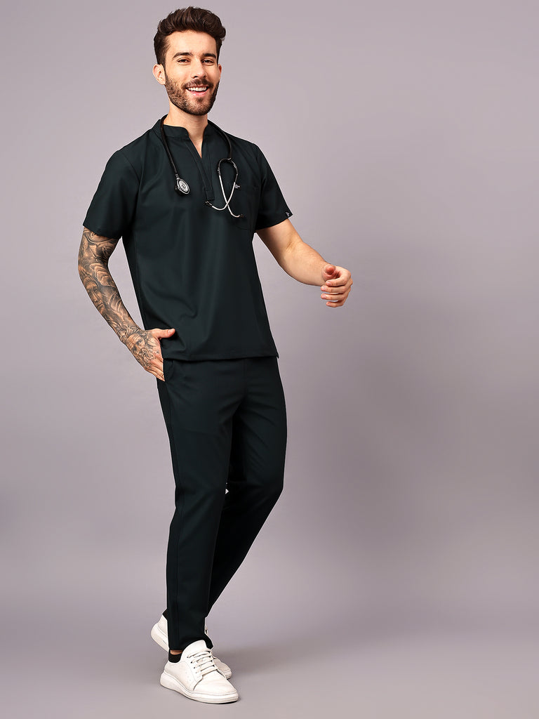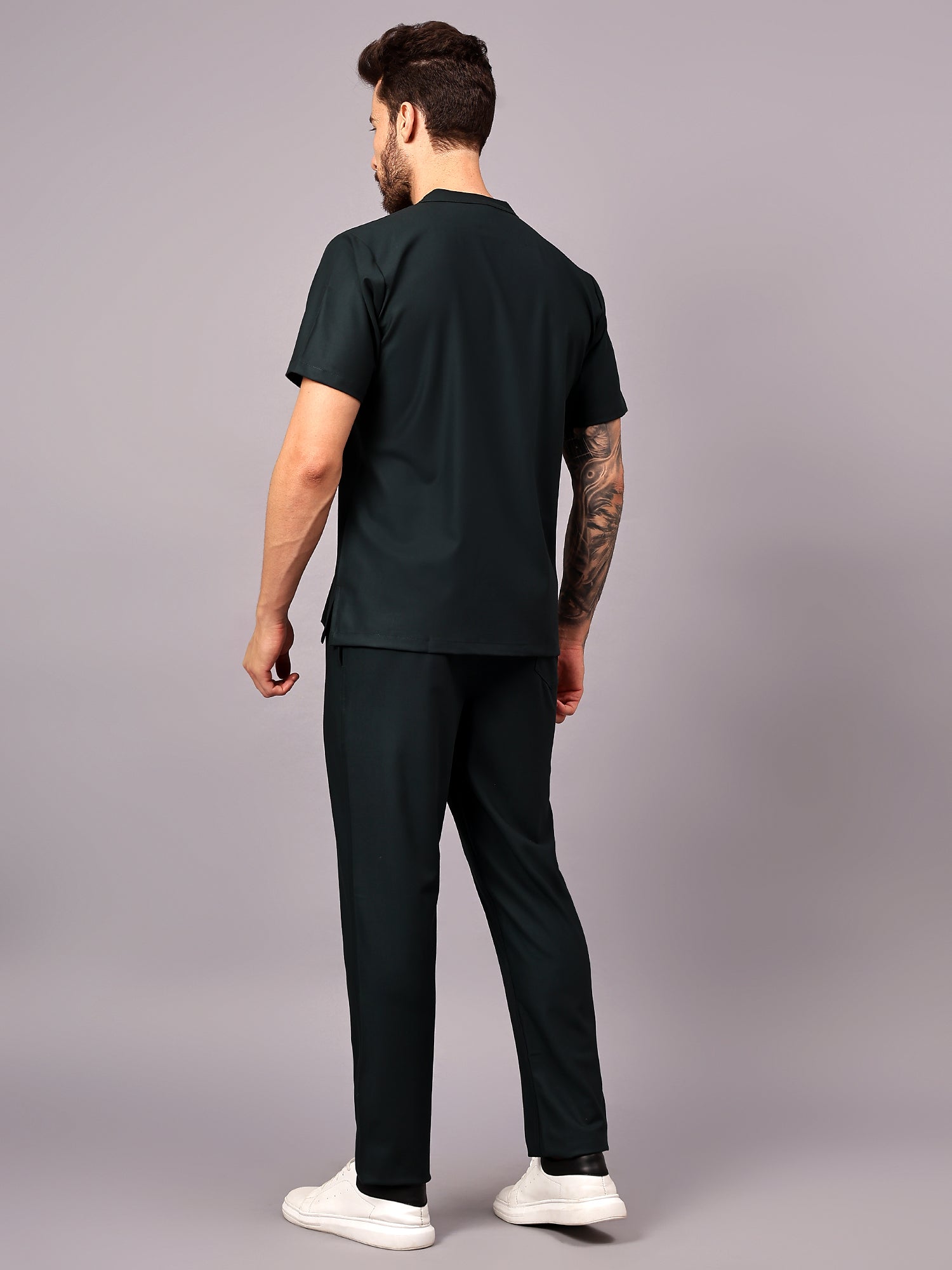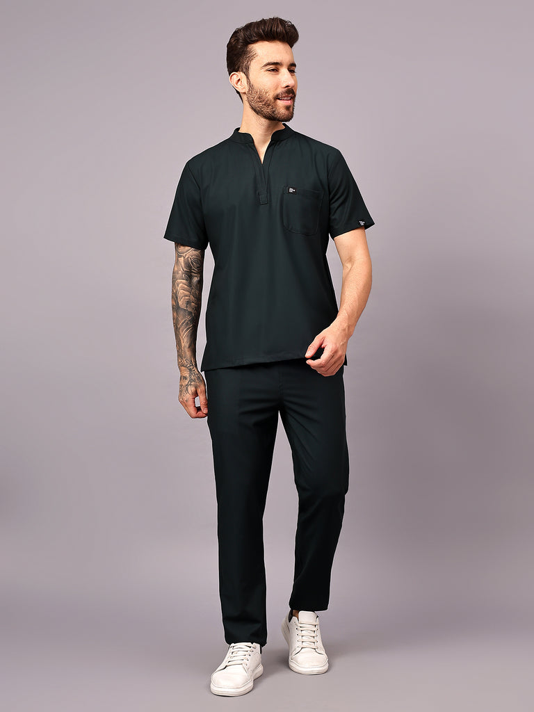 Stretchable (4Way) Male Mid Night Green Mandarin Neck with Straight Pant Scrub Set